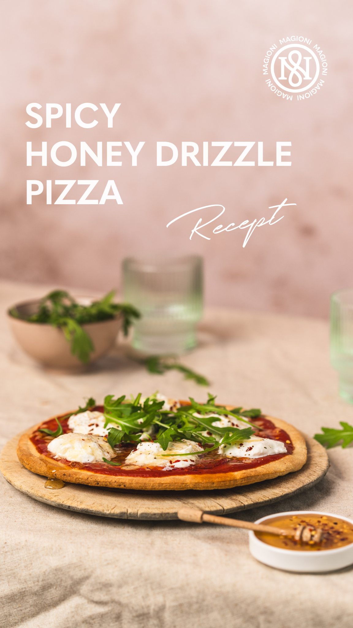 This pizza is a true flavor explosion! The Magioni cauliflower crust forms the perfect base for a delicious combination of creamy burrata, spicy pepperoni, and a sweet kick of hot honey with chili.