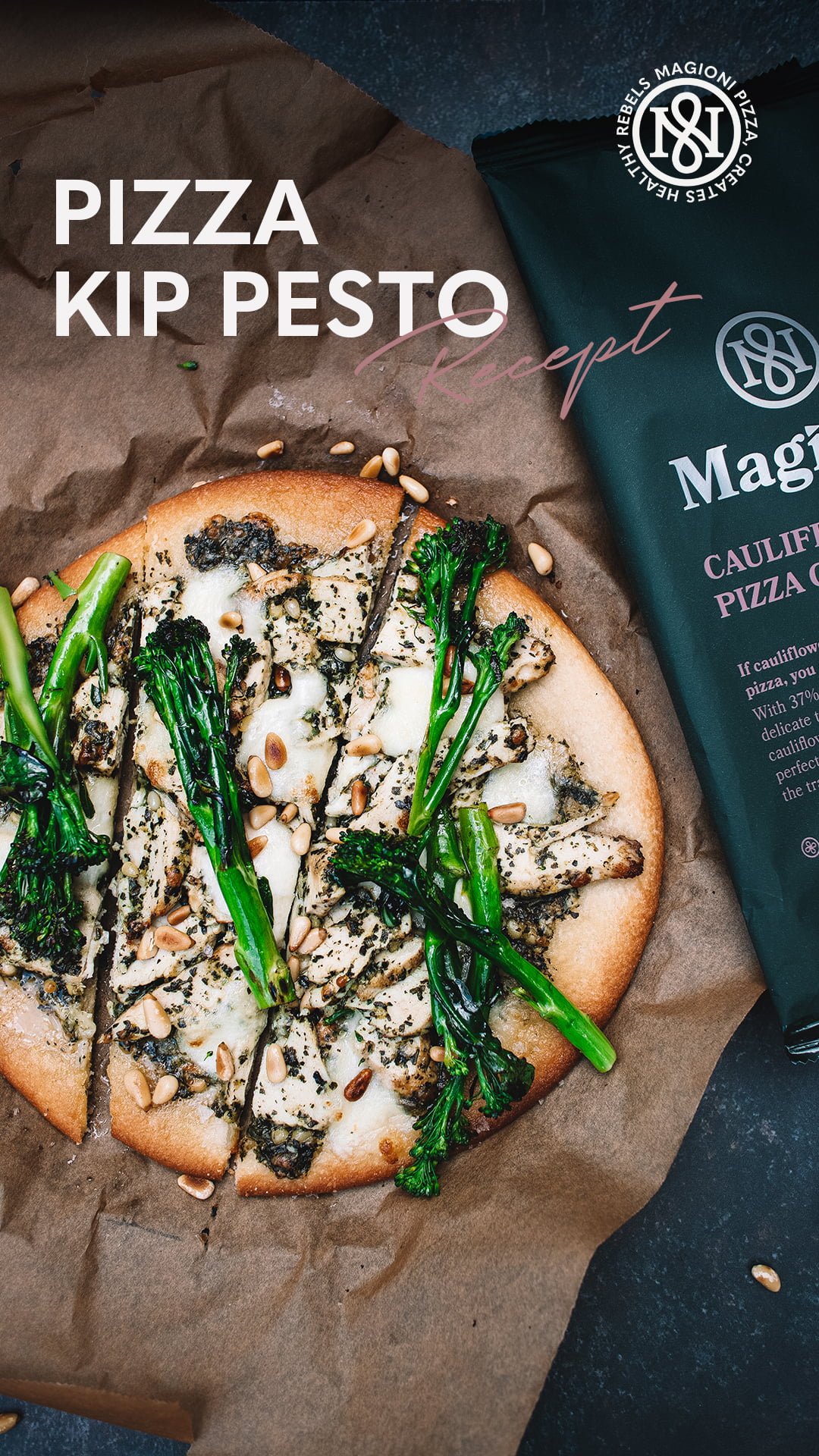 Deze pizza is belegd met pesto, (vega) kip, aspergebroccoli, pijnboompitten, mozzarella en Parmezaanse kaas!