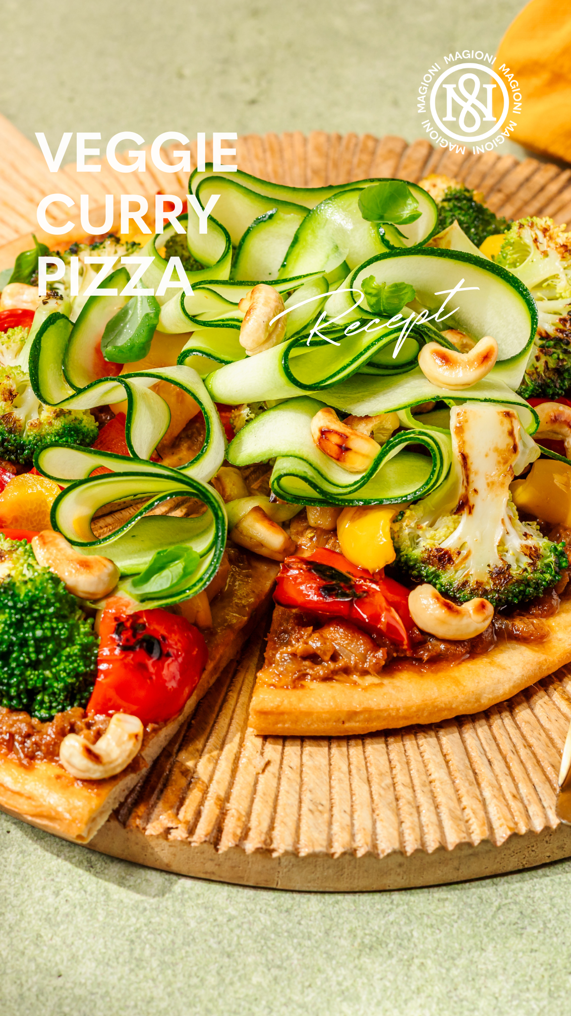 Zin in een verrassende twist op de klassieke pizza? Deze veggie curry pizza met Magioni bloemkoolbodem combineert het beste van twee werelden: de romige, licht pittige Thaise rode curry van Fairtrade Original en een regenboog aan verse groenten. Perfect voor wie op zoek is naar een voedzamere pizzavariant boordevol smaak en kleur. Met de crunchy cashewnoten, frisse courgettesliertjes en geurige basilicum tover je in een handomdraai een feestelijk fusion-gerecht op tafel. Ideaal voor als je wilt uitpakken tijdens een gezellige pizza-avond met vrienden!